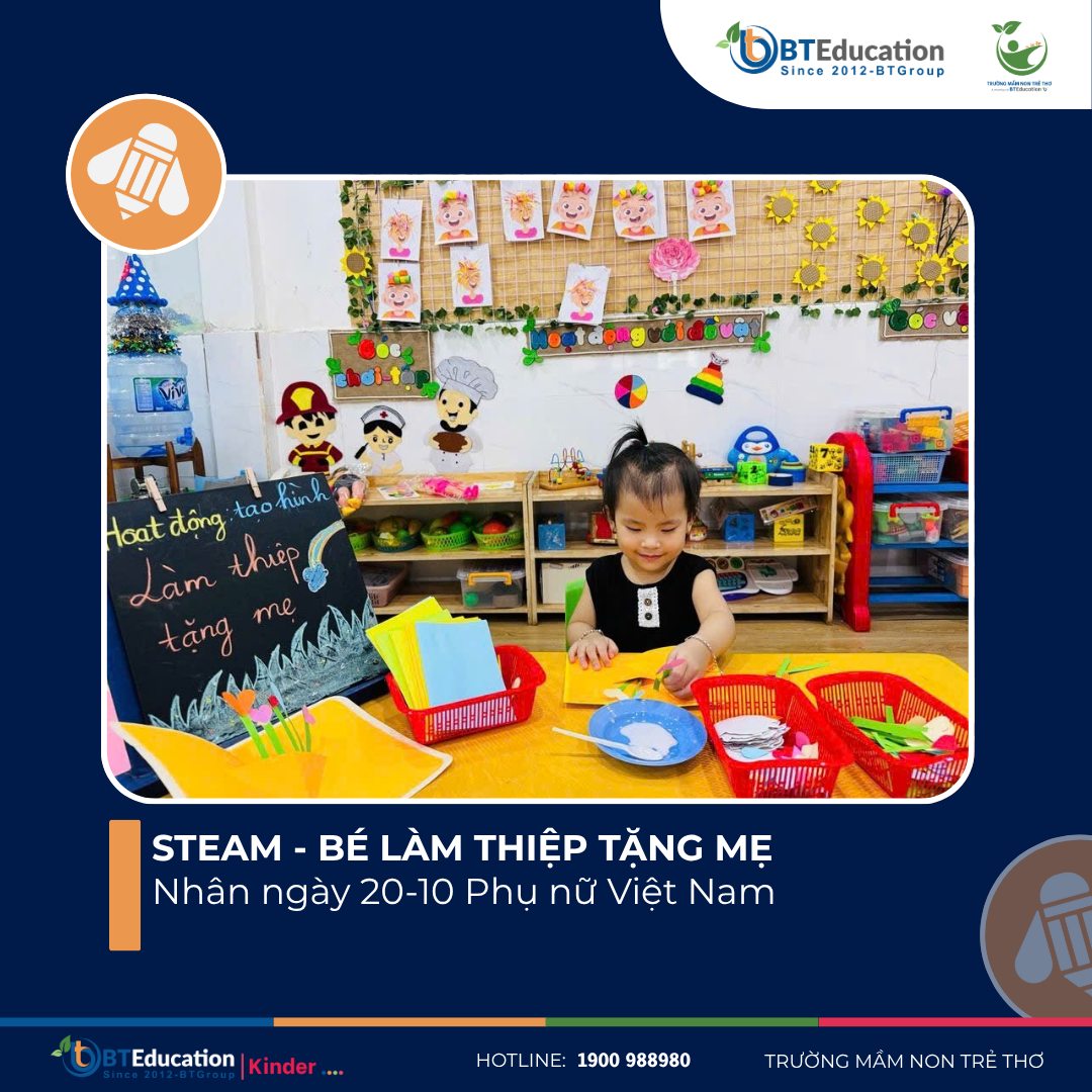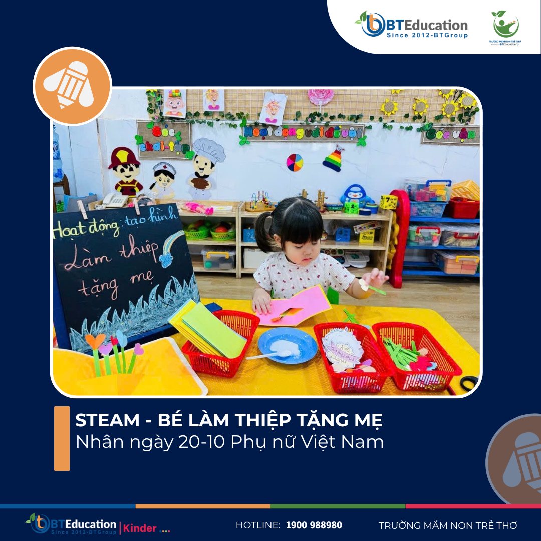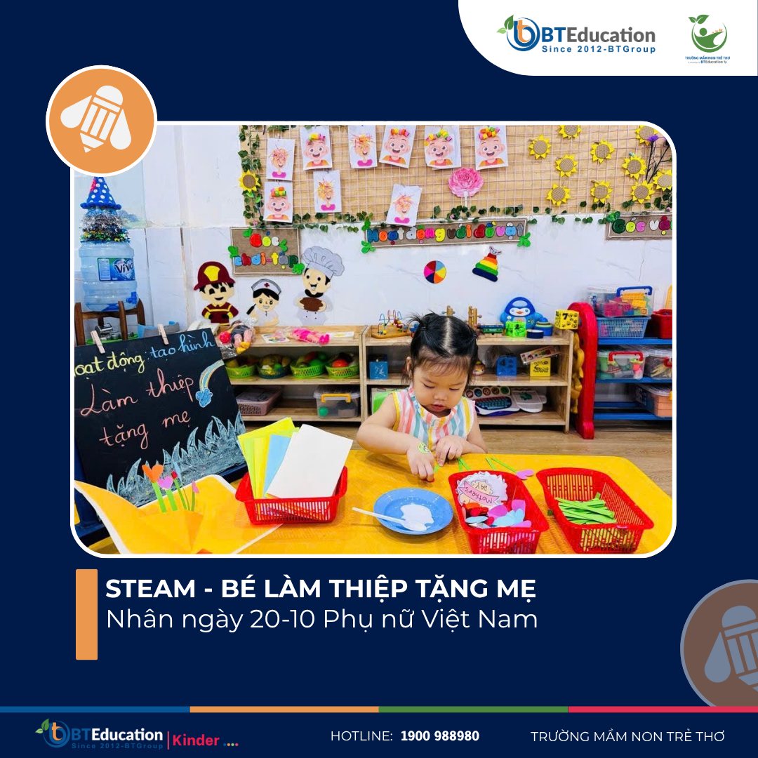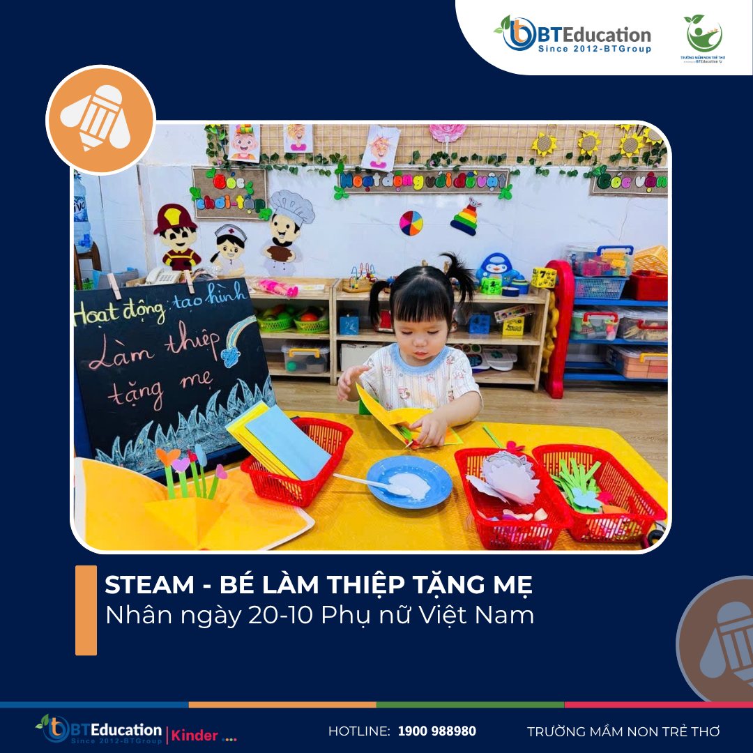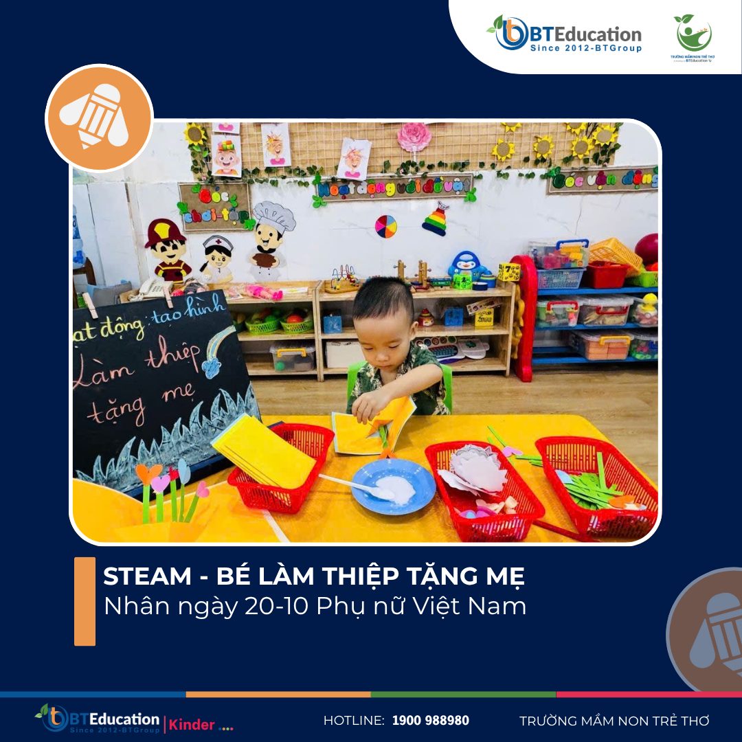 Món quà 20/10 đặc biệt nhất mẹ nhận hôm nay chính là chiếc thiệp ‘Made by bé’ này đây ạ! ❤️ Nhân dịp Ngày Phụ nữ Việt Nam, hai mẹ con mình đã cùng nhau thực hành dự án STEAM siêu dễ thương: ✨ Science & Art: Bé học về màu sắc, cách phối màu và sự hòa quyện của nước. ✨ Technology & Engineering: Bé tự tay dán, tính toán làm sao để tấm thiệp “đứng” được và mở ra có hình khối 3D. ✨ Math: Cùng nhau đo đạc, chia tỷ lệ để chiếc thiệp cân đối, xinh xắn. Thành phẩm là chiếc thiệp độc nhất vô nhị, tràn ngập tình yêu và sự sáng tạo. Yêu các con nhiều lắm, em bé nhỏ của mẹ! Chúc tất cả các cô, các mẹ một ngày 20/10 thật hạnh phúc! ————————————- Trường Mầm Non Trẻ Thơ Khởi đầu yêu thương – Starting with Love Địa chỉ: 10/5 Xuân Diệu, Phường Tân Sơn Nhất, Tp.HCM Hotline trường: 0847.988.980 ☎️ Hotline tuyển sinh: 0968.988.980 Website: tretho.edu.vn #BTEducation #BTGroup #TruongMamNonTreTho