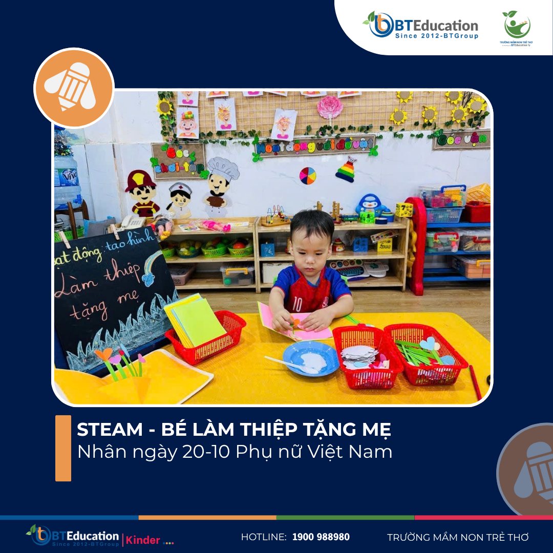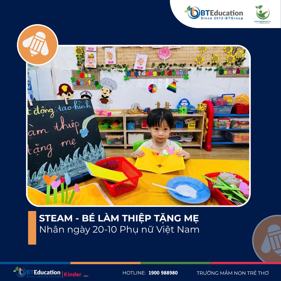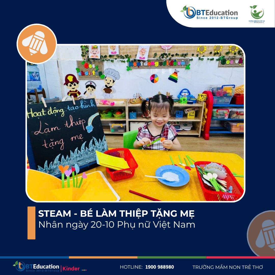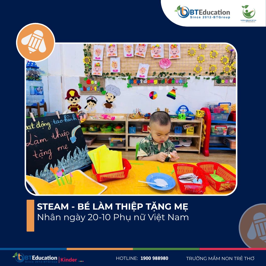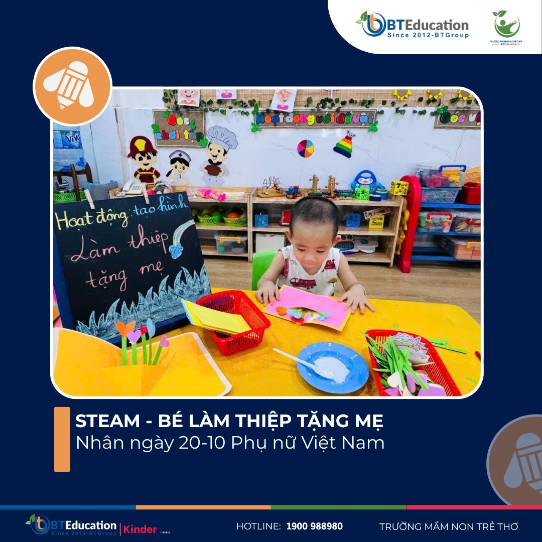 Món quà 20/10 đặc biệt nhất mẹ nhận hôm nay chính là chiếc thiệp ‘Made by bé’ này đây ạ! ❤️ Nhân dịp Ngày Phụ nữ Việt Nam, hai mẹ con mình đã cùng nhau thực hành dự án STEAM siêu dễ thương: ✨ Science & Art: Bé học về màu sắc, cách phối màu và sự hòa quyện của nước. ✨ Technology & Engineering: Bé tự tay dán, tính toán làm sao để tấm thiệp “đứng” được và mở ra có hình khối 3D. ✨ Math: Cùng nhau đo đạc, chia tỷ lệ để chiếc thiệp cân đối, xinh xắn. Thành phẩm là chiếc thiệp độc nhất vô nhị, tràn ngập tình yêu và sự sáng tạo. Yêu các con nhiều lắm, em bé nhỏ của mẹ! Chúc tất cả các cô, các mẹ một ngày 20/10 thật hạnh phúc! ————————————- Trường Mầm Non Trẻ Thơ Khởi đầu yêu thương – Starting with Love Địa chỉ: 10/5 Xuân Diệu, Phường Tân Sơn Nhất, Tp.HCM Hotline trường: 0847.988.980 ☎️ Hotline tuyển sinh: 0968.988.980 Website: tretho.edu.vn #BTEducation #BTGroup #TruongMamNonTreTho